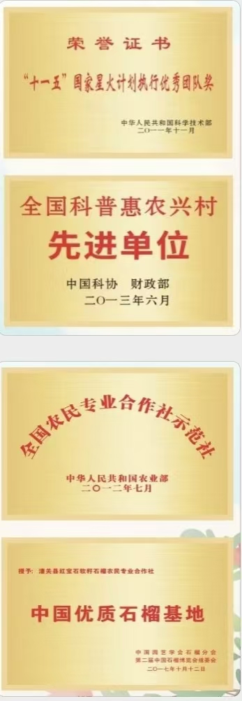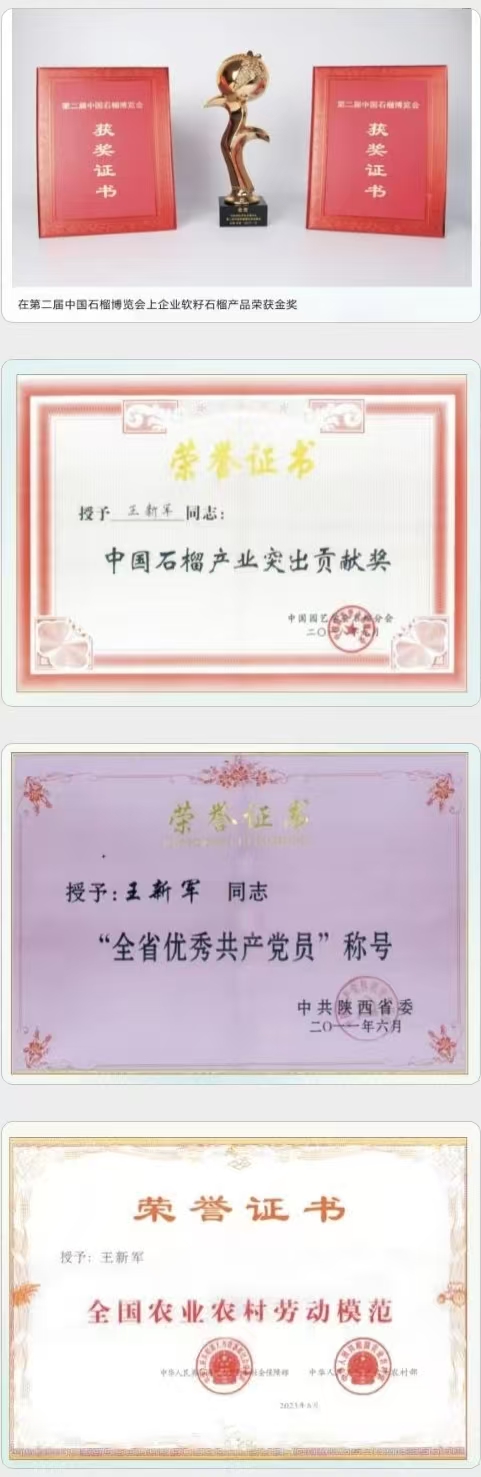 王新军的软籽石榴项目被列为“陕西省重点项目” “渭南市第六大果业品牌”,潼关县农业经济发展“首位”产业。“岳渎红软籽”石榴先后获得中国绿色食品发展中心“绿色食品证书”、第二届中国石榴博览会“金奖”和“中国优质石榴基地”称号、第二十五届中国杨凌农高会“后稷奖”、第十八届中国国际农产品交易会“最受欢迎产品”、第十四届全运会官方“特许产品”。他深知,这些荣誉不仅是对个人的肯定,更是对整个农业农村工作者的鼓舞和激励。