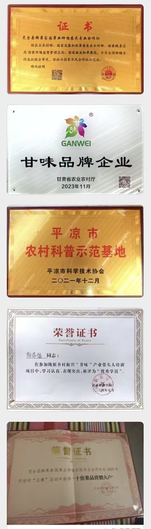 2022年7月被县政府评定为乡村就业工厂,县级农民工返乡创业示范基地,2023年被农业农村部评为国家级示范社;同年合作社理事长柏存福当选甘肃省第十四届人大代表,2025年,灵台县第8个农民丰收节获得十佳果品组“金奖”,同年,平凉市“五赛”活动中获得“十佳果品营销大户”。