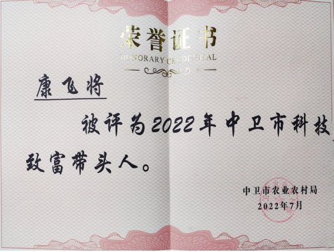 康飞将,荣获“中卫市科技致富带头人”,现任宁夏康园种植养殖专业合作社总经理,他是海原县的一位返乡创业典型,通过发展肉牛养殖产业,不仅自己致富,还带动了当地群众共同增收。他的创业故事和助残事迹得到了广泛认可,他本人也被誉为当地的“攒劲人”和“乡村振兴龙头企业”带头人。